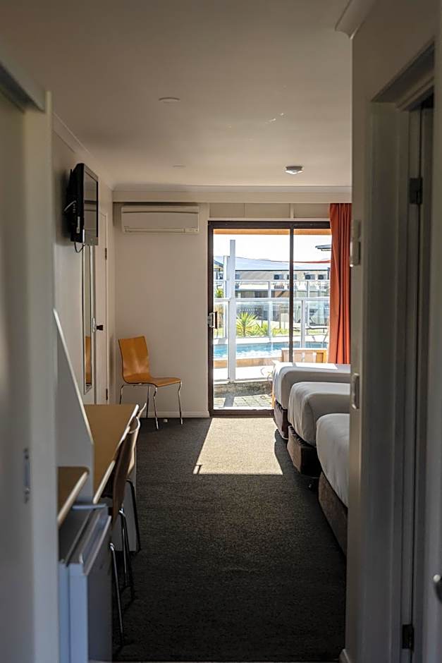 This refurbished room overlooks the pool, playground and BBQ area. It has a 32-inch flat-screen TV.